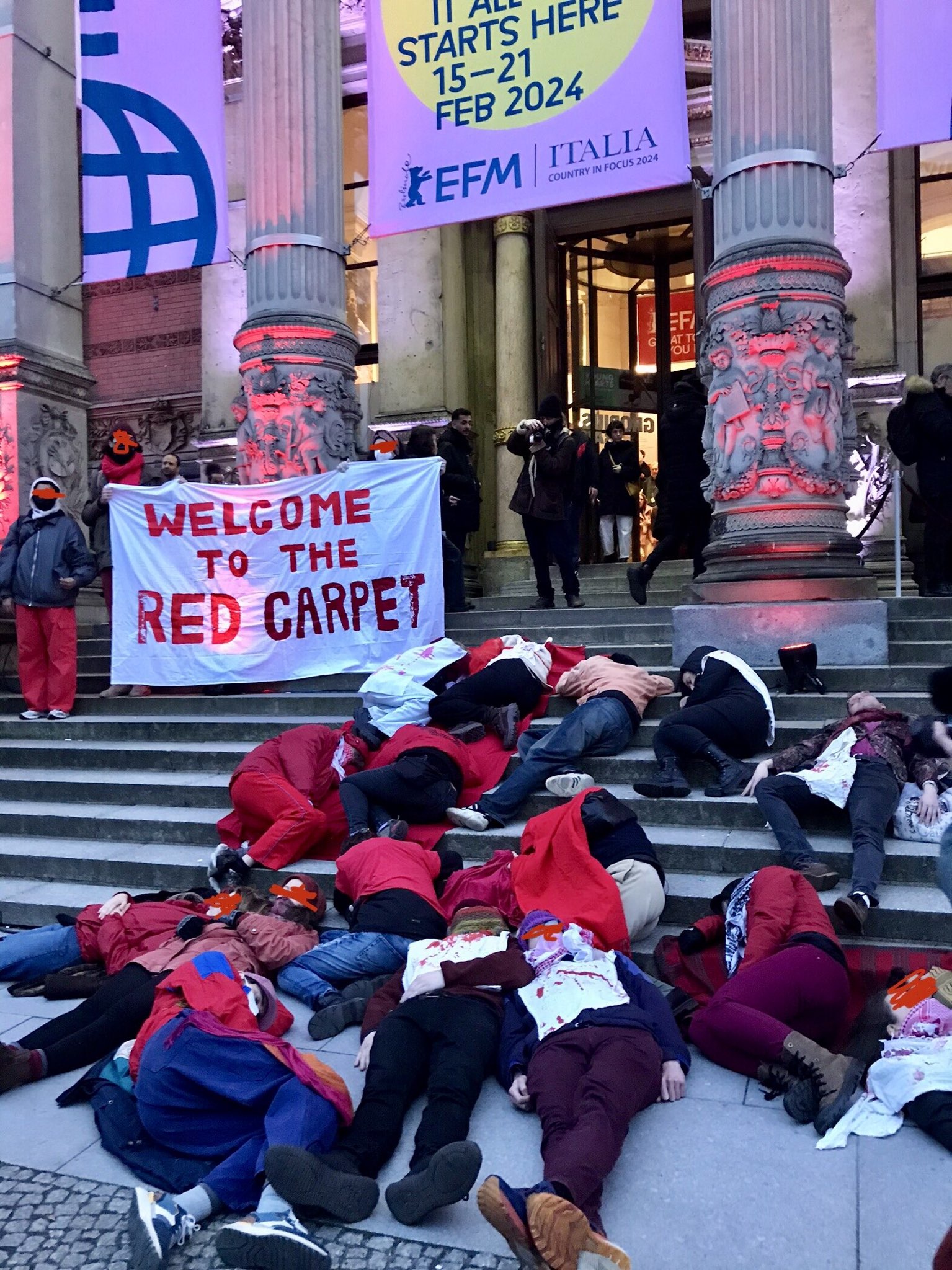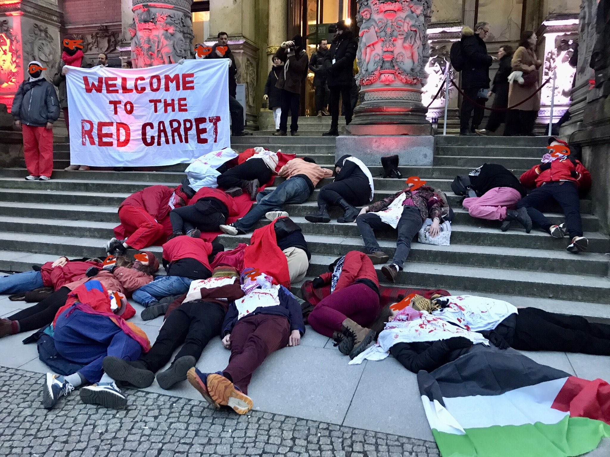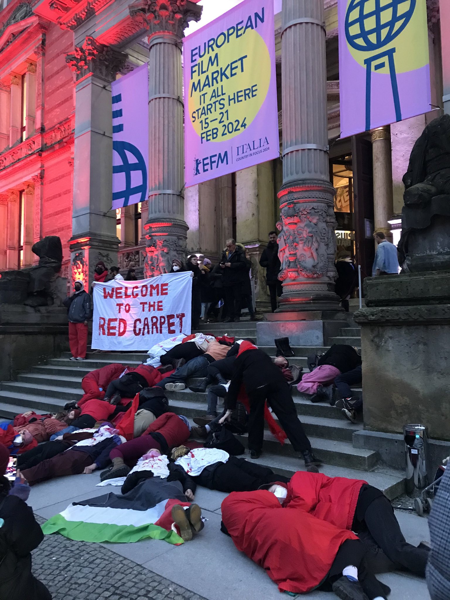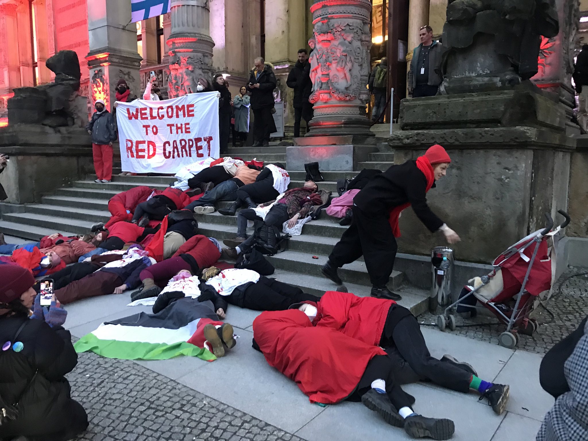 Aktivist*innen haben mit kurzen Redebeiträgen, Parolen und einer die-in-action auf dem roten Teppich auf den vom Internationalen Gerichtshof für plausibel erachteten Völkermord, den Israel im Gazastreifen verübt, aufmerksam gemacht.