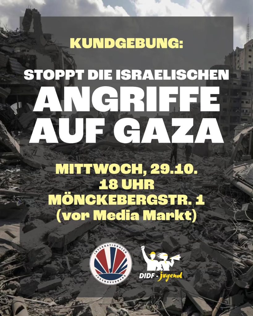 Veranstaltungskalender Kategorie: General Kundgebung: Stoppt die israelischen Angriffe auf Gaza 18:00 29. Oktober 2025 HamburgVeranstaltungsort anschauen Kompletten Kalender ansehen