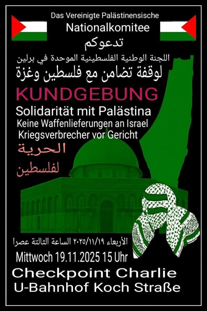 Kategorie: General Kundgebung: Solidarität mit Palästina - Keine Waffenlieferungen an Israel -Kriegsverbrecher vor Gericht 15:00 19. November 2025 BerlinVeranstaltungsort anschauen Kompletten Kalender ansehen
