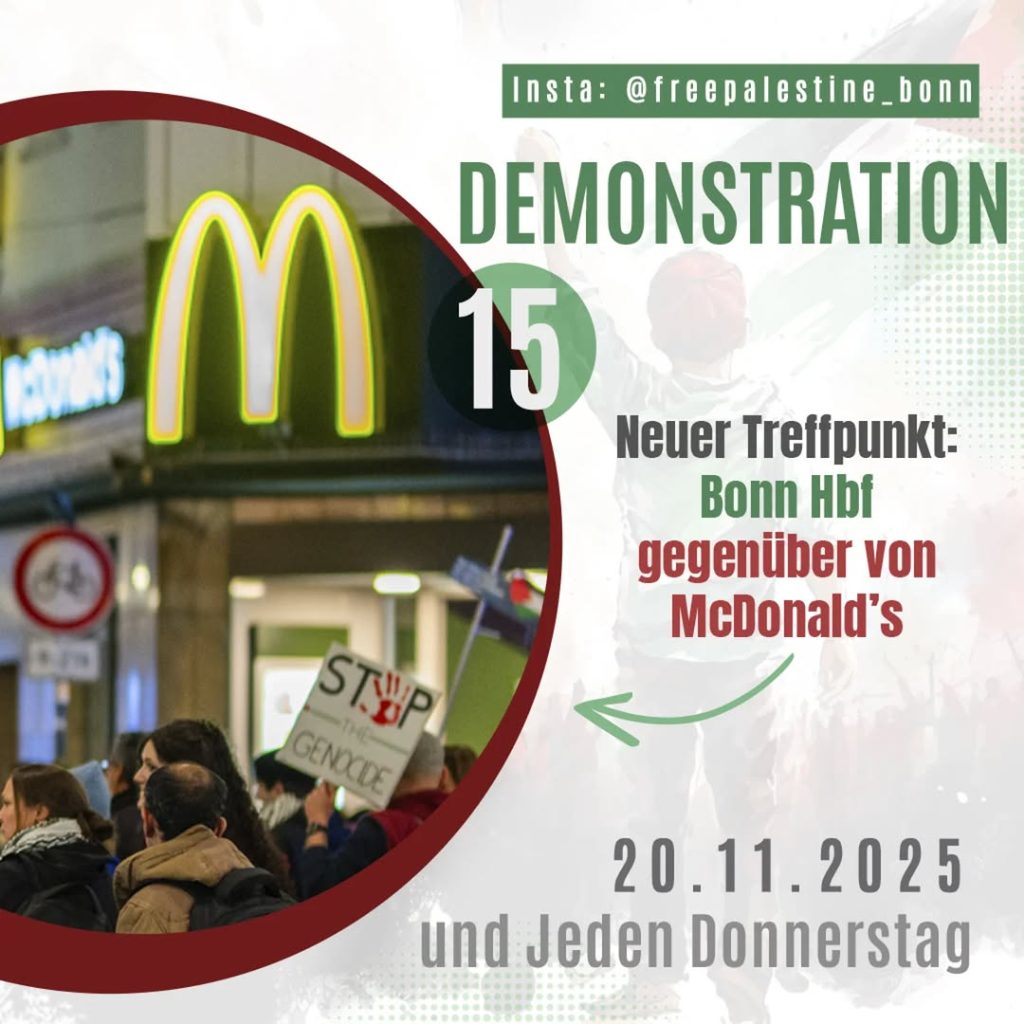 Kategorie: General Demonstration - Gaza geht die Zeit aus - Bonn Hbf 18:00 20. November 2025 BonnVeranstaltungsort anschauen Kompletten Kalender ansehen