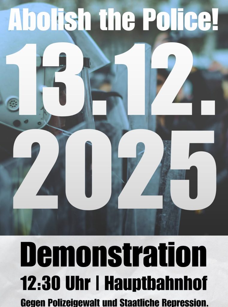Veranstaltungskalender Kategorie: General Demonstration - Abolish the Police! - Gegen Polizeigewalt und staatliche Repressionen 12:30 13. Dezember 2025 WürzburgVeranstaltungsort anschauen Kompletten Kalender ansehen