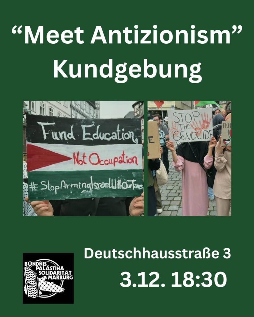 Kategorie: General Kundgebung "Meet Antizionism" - Deutschhausstraße 3 18:00 3. Dezember 2025 MarburgVeranstaltungsort anschauen Kompletten Kalender ansehen