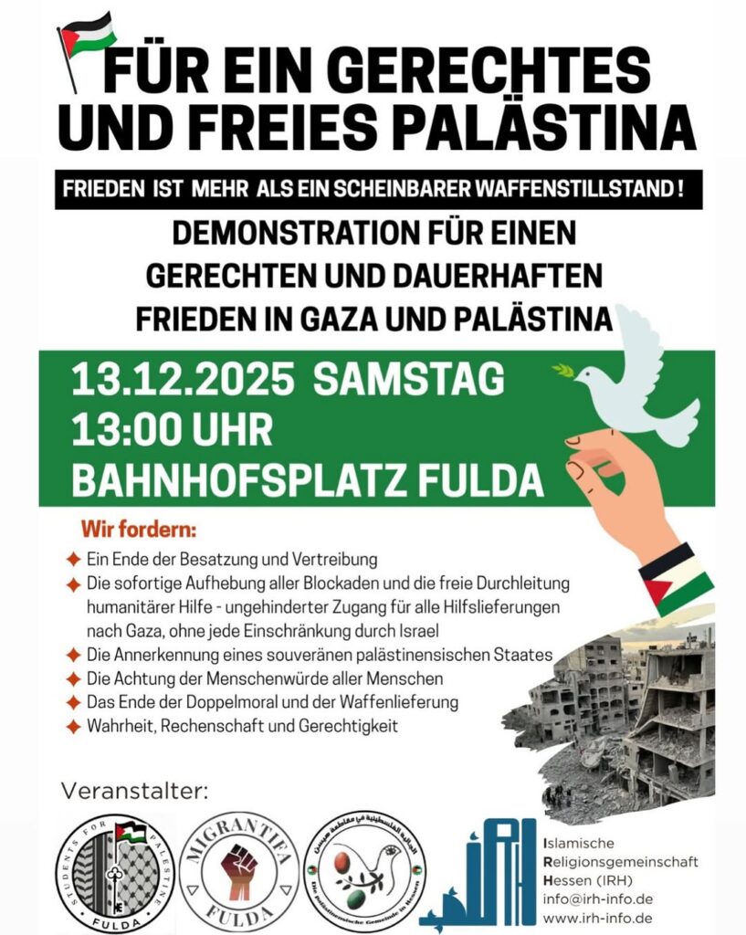 Veranstaltungskalender Kategorie: General Demonstration für einen gerechten und dauerhaften Frieden in Gaza und Palästina 13:00 13. Dezember 2025 FuldaVeranstaltungsort anschauen Kompletten Kalender ansehen
