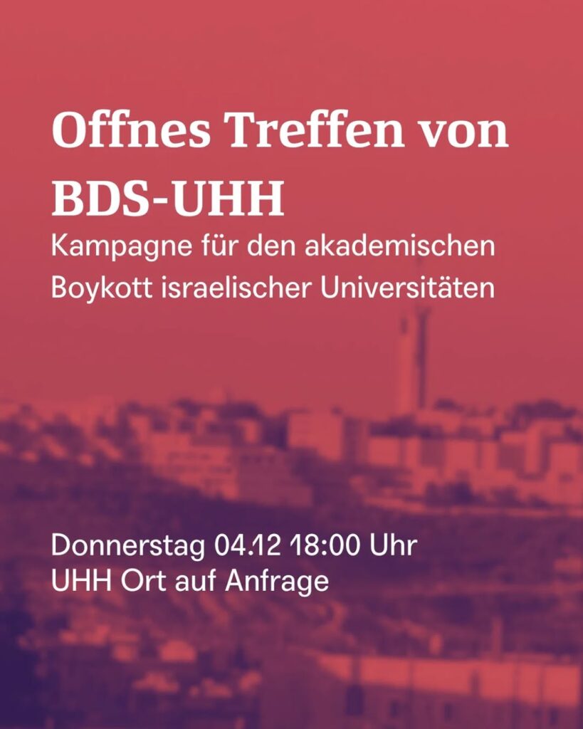 Kategorie: General Offenes Treffen von BDS-UHH - Kampagne für den akademischen Boykott israelischer Universitäten 18:00 4. Dezember 2025 HamburgVeranstaltungsort anschauen Kompletten Kalender ansehen