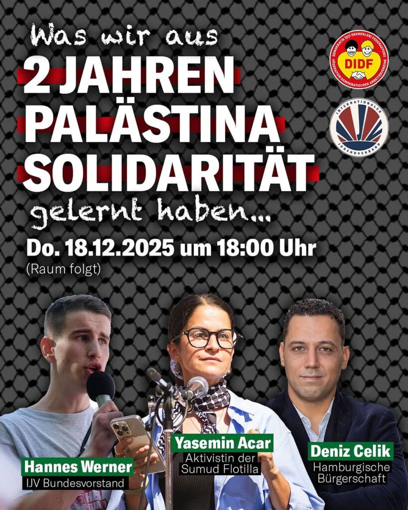 Veranstaltungskalender Kategorie: General Was wir aus 2 Jahren Palästina Solidarität gelernt haben ... 18:00 – 19:0018. Dezember 2025 HamburgVeranstaltungsort anschauen Kompletten Kalender ansehen