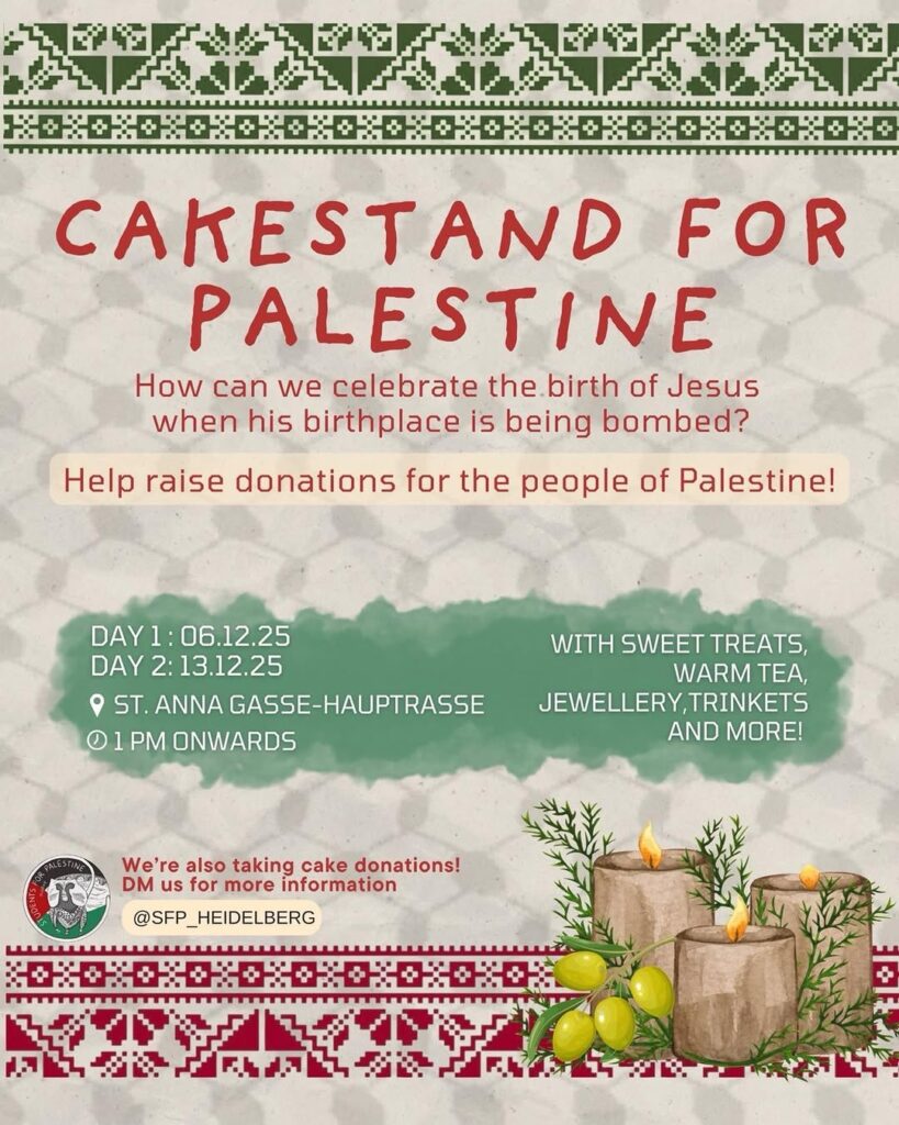 Veranstaltungskalender Kategorie: General Cakestand for Palestine - How can we celebrate the birth of Jesus when his birthplace is being bombed? 13:00 6. Dezember 2025 HeidelbergVeranstaltungsort anschauen Kompletten Kalender ansehen