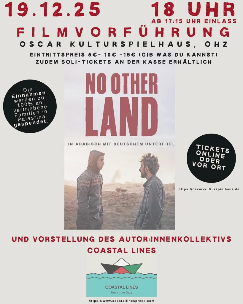 Veranstaltungskalender Kategorie: General Filmvorführung mit Soli-Tickets - No other Land 17:15 19. Dezember 2025 BremenVeranstaltungsort anschauen Kompletten Kalender ansehen