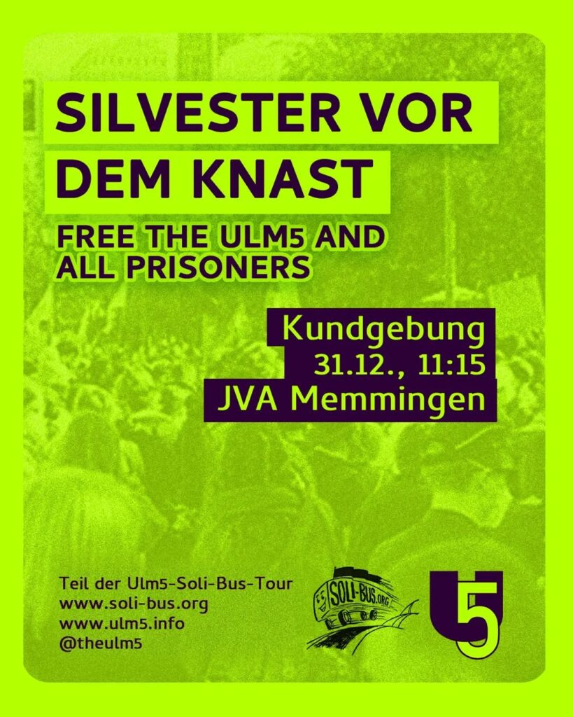 Kategorie: General Silvester vor dem Knast - Free the Ulm5 and all prisoners 11:15 31. Dezember 2025 MemmingenVeranstaltungsort anschauen Kompletten Kalender ansehen