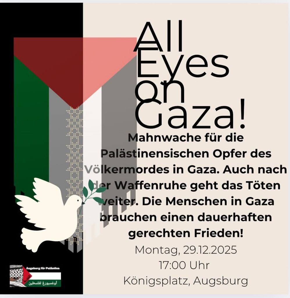 Veranstaltungskalender Kategorie: General Mahnwache für die palästinensischen Opfer des Völkermords in Gaza 17:00 29. Dezember 2025 AugsburgVeranstaltungsort anschauen Kompletten Kalender ansehen