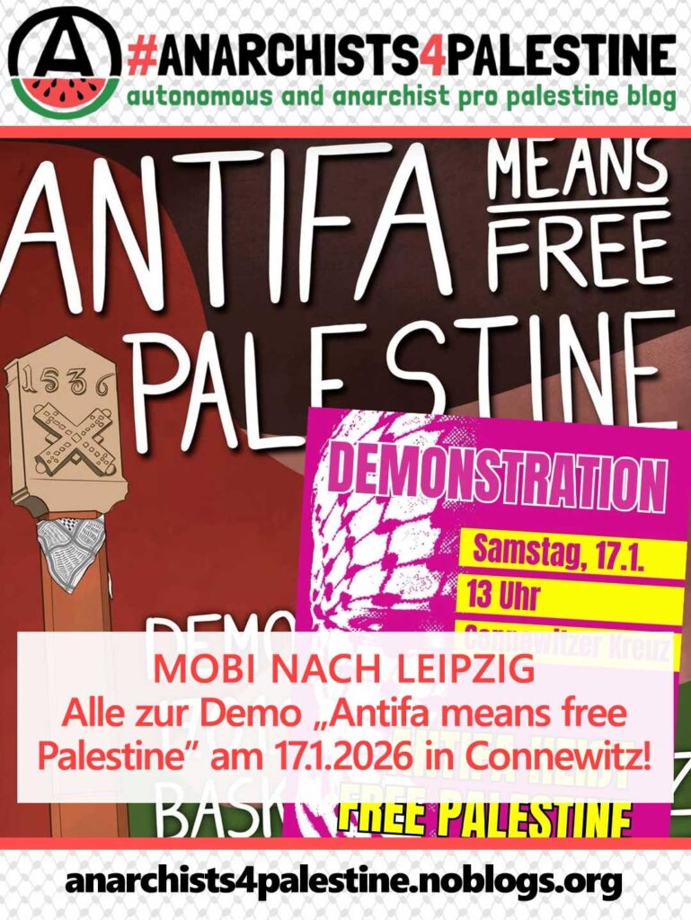 Kategorie: General Demonstration - Antifa means Free palestine 13:00 17. Januar 2026 LeipzigVeranstaltungsort anschauen Kompletten Kalender ansehen