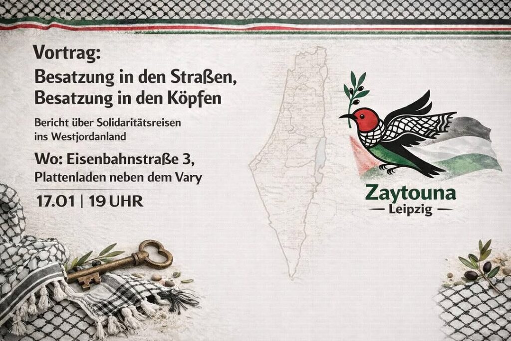 Kategorie: General Vortrag: Besatzung in den Straßen, Besatzung in den Köpfen 19:00 17. Januar 2026 LeipzigVeranstaltungsort anschauen Kompletten Kalender ansehen