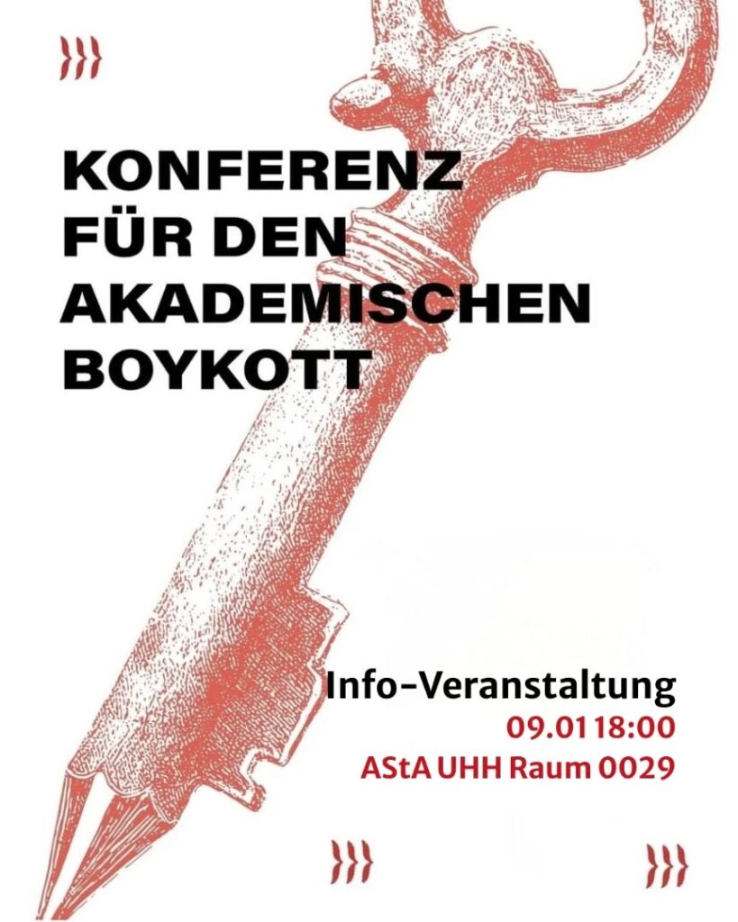 Kategorie: General Info-Veranstaltung zur Konferenz für den akademischen Boykott in Berlin 18:00 9. Januar 2026 HamburgVeranstaltungsort anschauen Kompletten Kalender ansehen