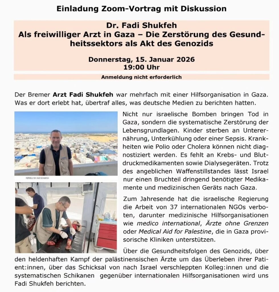 Kategorie: General Zoom-Vortrag mit Diskussion - Die Zerstörung des Gesundheitssektors als Akt des Genozids 19:00 15. Januar 2026 ZOOM-VeranstaltungVeranstaltungsort anschauen Kompletten Kalender ansehen
