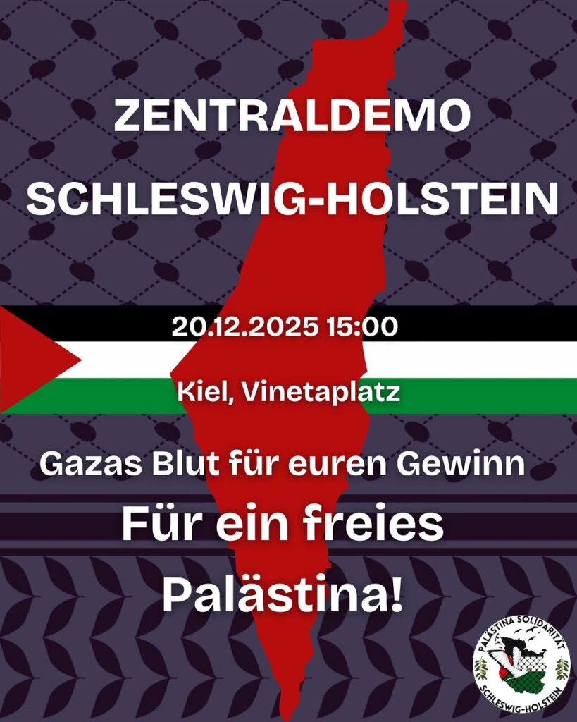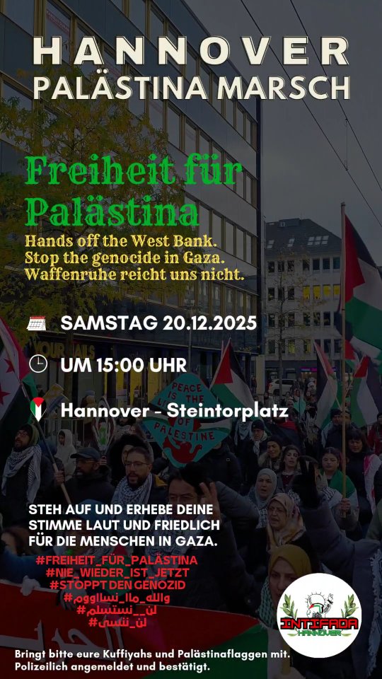 تضامنًا مع أهلنا في فلسطين، ودعمًا لصمود شعبنا في الضفة الغربية وقطاع غزة، ورفضًا قاطعًا للاحتلال والإبادة المستمرة، ورفضًا لتصدير ألمانيا الأسلحة لهذا الاحتلال، ندعوكم يوم السبت الموافق 20/12/2025 في تمام الساعة الثالثة مساءً، للمشاركة في المسيرة بمدينة هانوفر - ساحةالشتاينتور.Wir laden euch am Samstag, den 20.12.2025, um 15:00 Uhr zu einem Marsch am Steintorplatz ein, um gegen den Genozid und die deutschen Waffenexporte an Israel zu protestieren und um Solidarität mit unseren Geschwistern in Palästina zu zeigen. Gemeinsam sind wir stärker!HannoverZentraldemo Schleswig-Holstein - Gazas Blut für euren Gewinn - Für ein freies Palästina Zentraldemo Schleswig-Holstein - Gazas Blut für euren Gewinn - Für ein freies Palästina
