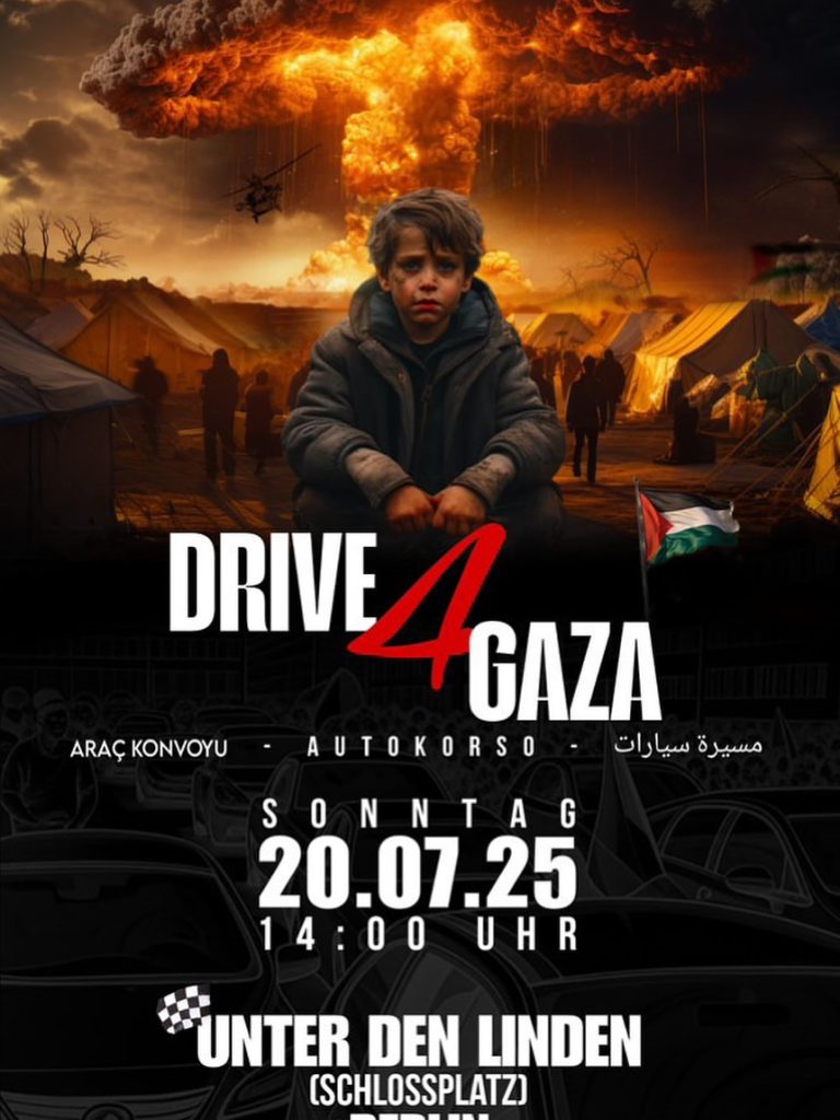 Kategorie: General DRIVE4GAZA - Autokorso - Unter den Linden (Schlossplatz) 14:00 20. Juli 2025 BerlinVeranstaltungsort anschauen Kompletten Kalender ansehen