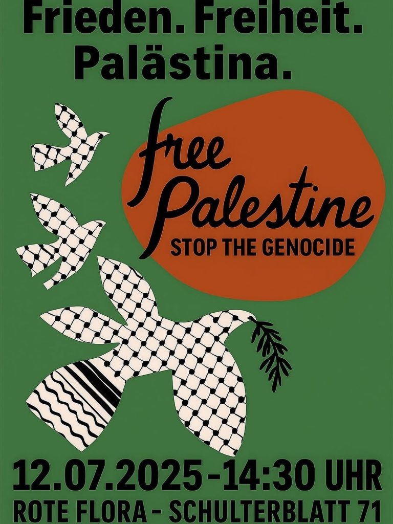 Kategorie: General Free Palestine - Stop the Genocide - Rote Flora 14:30 12. Juli 2025 HamburgVeranstaltungsort anschauen Kompletten Kalender ansehen