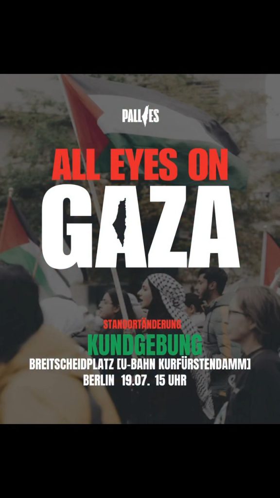 Kategorie: General Kundgebung - All eyes on Gaza - Breitscheidplatz 15:00 19. Juli 2025 BerlinVeranstaltungsort anschauen Kompletten Kalender ansehen