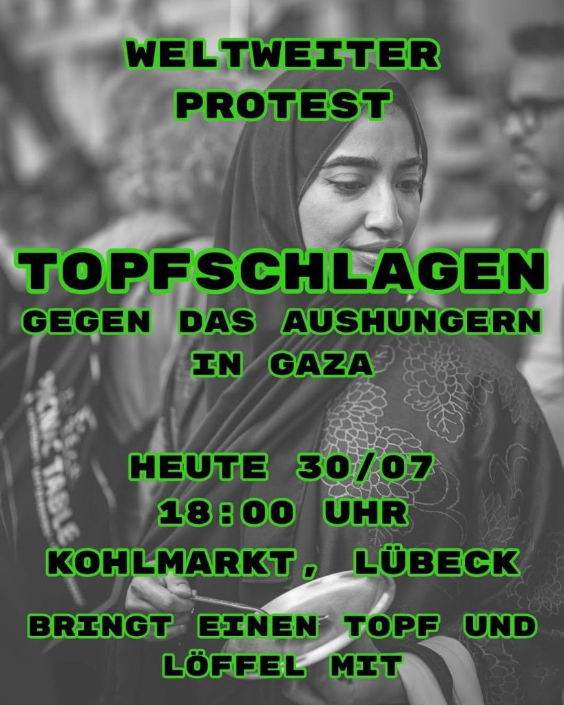 Kategorie: General Weltweiter Protest - Topfschlagen gegen das Aushungern in Gaza 18:00 30. Juli 2025 LübeckVeranstaltungsort anschauen Kompletten Kalender ansehen