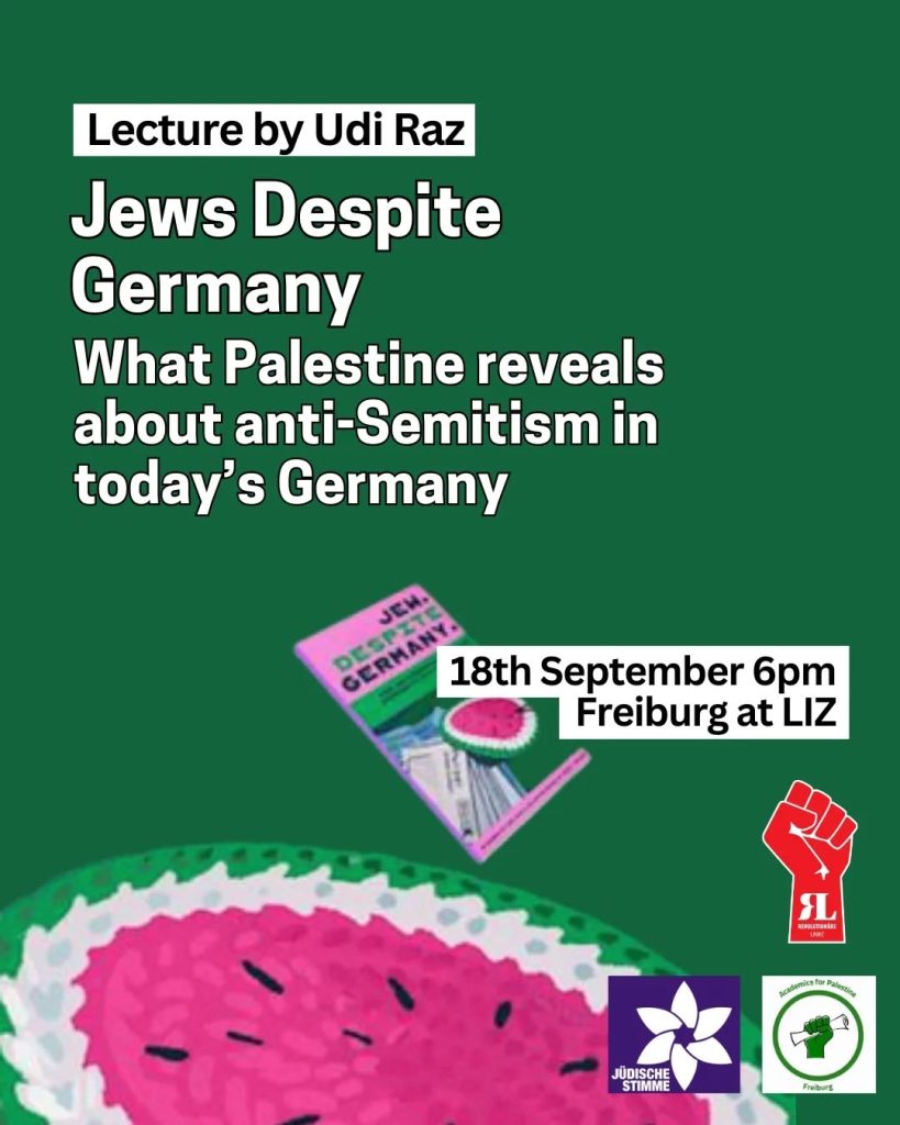 Kategorie: General Lecture by Udi Raz - Jews despite Germany - What Palestine reveals about anti-Semitism in today's Germany 18:00 18. September 2025 FreiburgVeranstaltungsort anschauen Kompletten Kalender ansehen