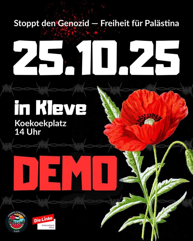 Kategorie: General Demo - Stoppt den Genozid - Freiheit für Palästina 14:00 25. Oktober 2025 KleveVeranstaltungsort anschauen Kompletten Kalender ansehen