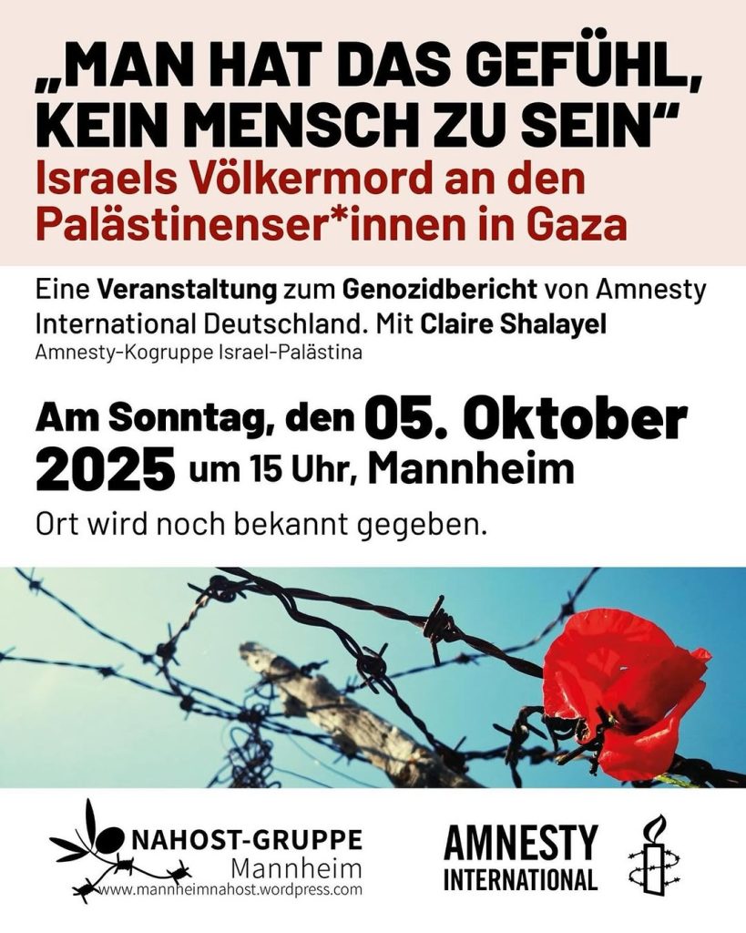 Kategorie: General Veranstaltung zum Genozidbericht von Amnesty International Deutschland. Mit Claire Shalayel 15:00 5. Oktober 2025 MannheimVeranstaltungsort anschauen Kompletten Kalender ansehen