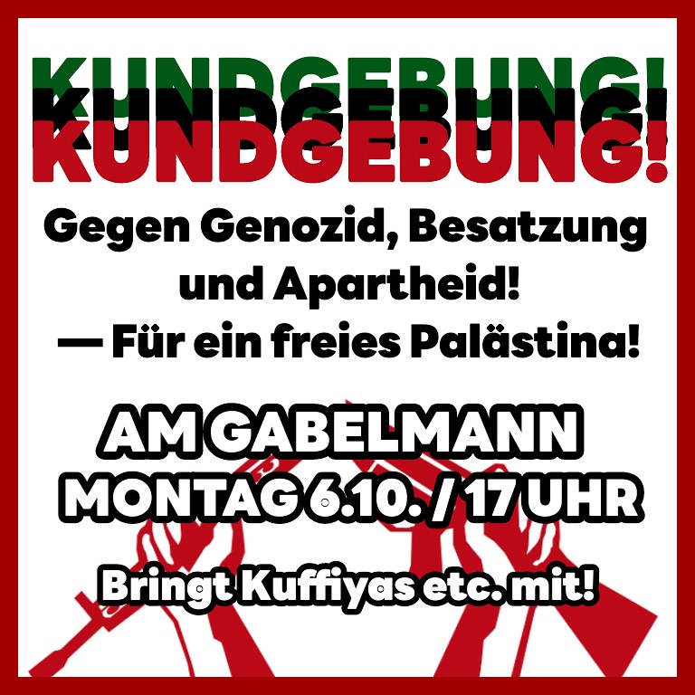 Kategorie: General Kundgebung gegen Genozid, Besatzung und Apartheid! - Für ein freies Palästina! 17:00 6. Oktober 2025 BambergVeranstaltungsort anschauen Kompletten Kalender ansehen