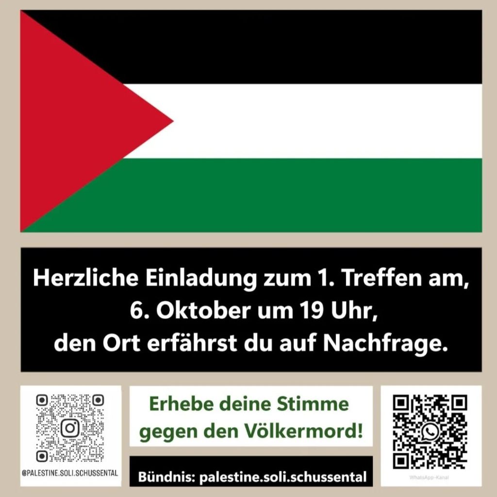 Kategorie: General Einladung zum 1. Treffen - palestine.soli.schussental 19:00 6. Oktober 2025 SchussentalVeranstaltungsort anschauen Kompletten Kalender ansehen
