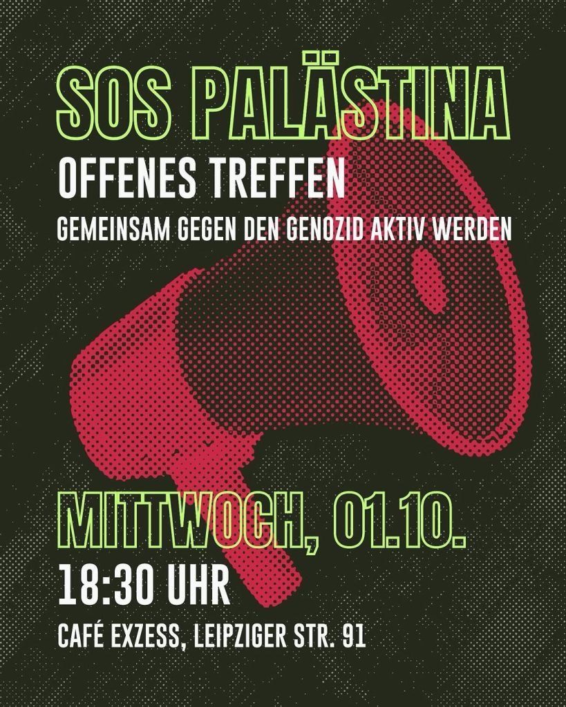 Kategorie: General SOS Palästina - Offenes Treffen - Gemeinsam gegen den Genozid aktiv werden 18:30 1. Oktober 2025 Frankfurt / MVeranstaltungsort anschauen Kompletten Kalender ansehen