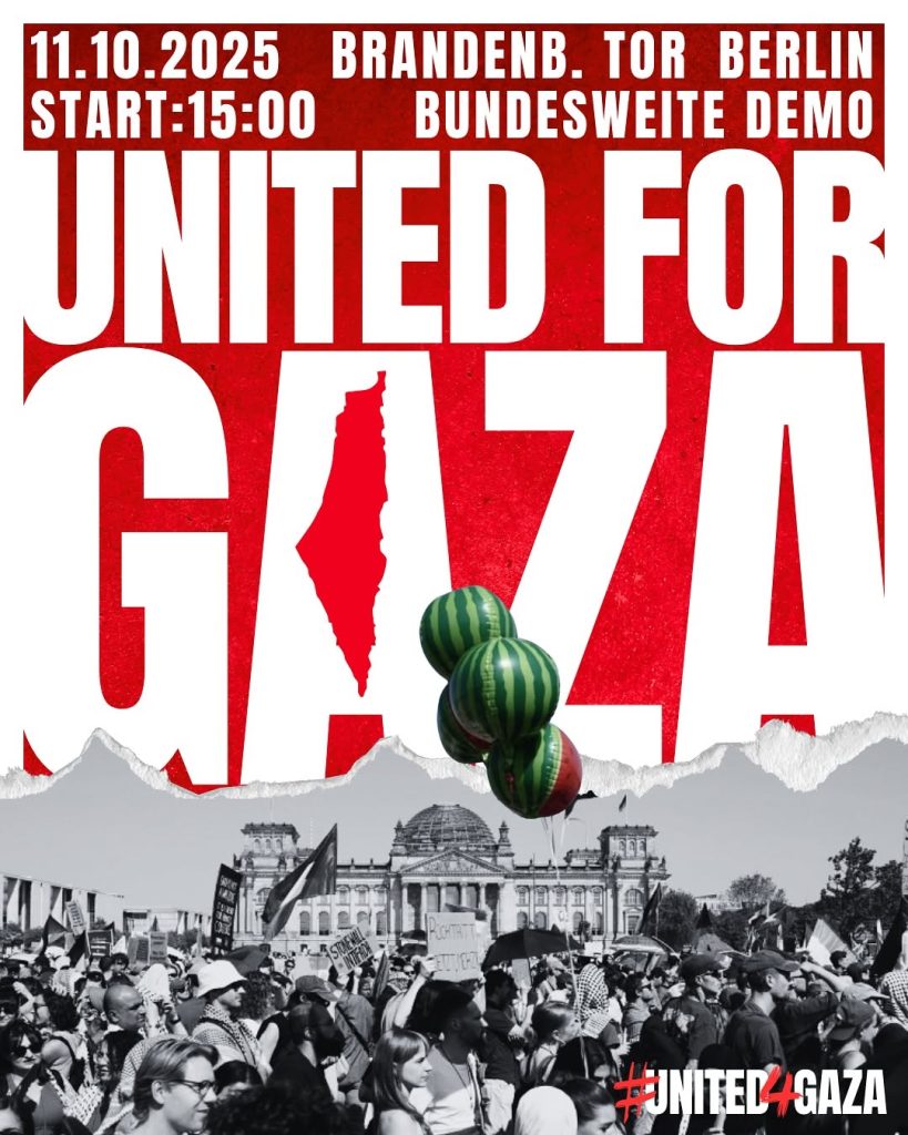 Kategorie: General Bundesweite Demo - United for Gaza - Brandenburger Tor 15:00 11. Oktober 2025 BerlinVeranstaltungsort anschauen Kompletten Kalender ansehen