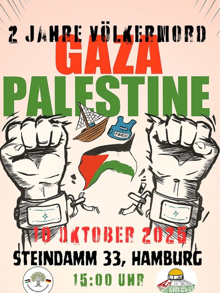 Kategorie: General Gaza - Palestine - 2 Jahre Völkermord - Steindamm 15:00 10. Oktober 2025 HamburgVeranstaltungsort anschauen Kompletten Kalender ansehen