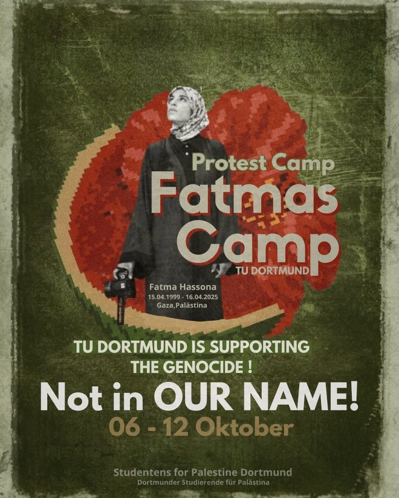 Kategorie: General Protest Camp 'Fatmas Camp' TU Dortmund - Not in our name! 12:00 6. Oktober 2025 DortmundDortmund, Veranstaltungsort anschauen Kompletten Kalender ansehen