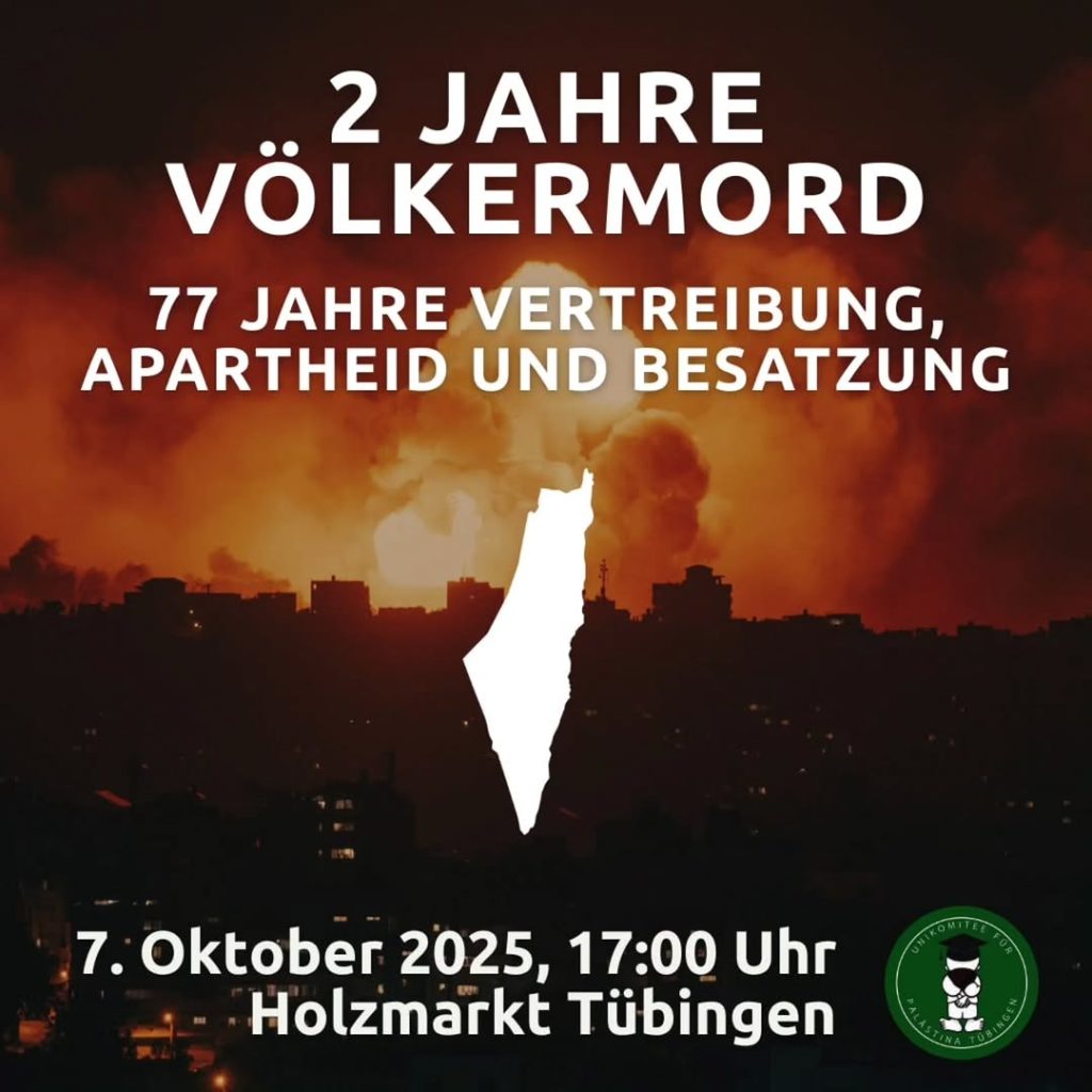 Kategorie: General 2 Jahre Völkermord - 77 Jahre Vertreibung, Apartheid und Besatzung 17:00 7. Oktober 2025 TübingenVeranstaltungsort anschauen Kompletten Kalender ansehen