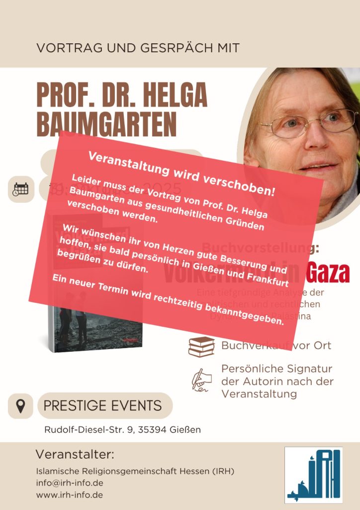 Veranstaltungskalender Kategorie: General Buchvorstellung: Völkermord in Gaza, mit Prof. Dr. Helga Baumgarten - VERSCHOBEN 18:30 31. Oktober 2025 GießenVeranstaltungsort anschauen Kompletten Kalender ansehen