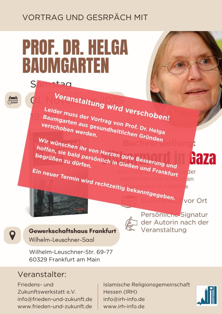 Veranstaltungskalender Kategorie: General Buchvorstellung: Völkermord in Gaza, mit Prof. Dr. Helga Baumgarten - VERSCHOBEN! 19:00 1. November 2025 Frankfurt / MVeranstaltungsort anschauen Kompletten Kalender ansehen