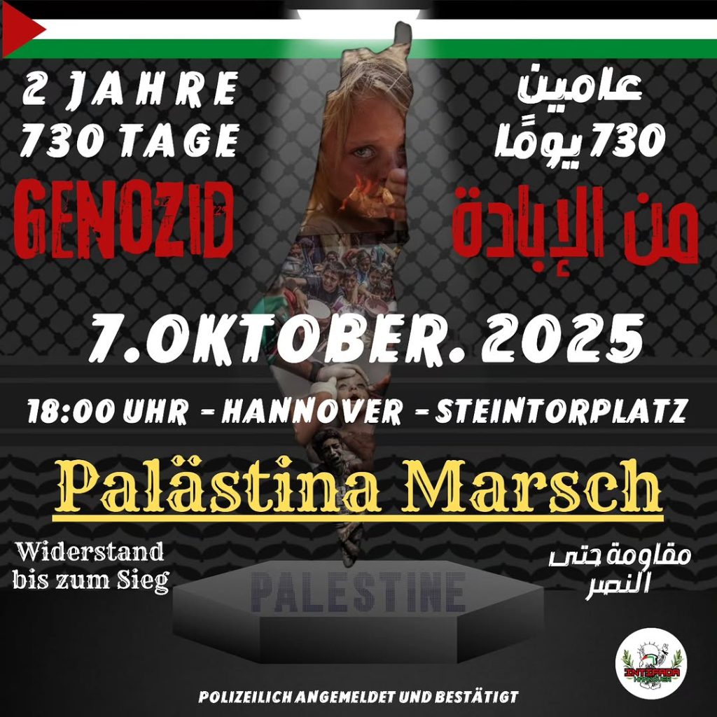 Kategorie: General Palästina Marsch - 2 Jahre 730 Tage Genozid - Widerstand bis zum Sieg 18:00 7. Oktober 2025 HannoverVeranstaltungsort anschauen Kompletten Kalender ansehen