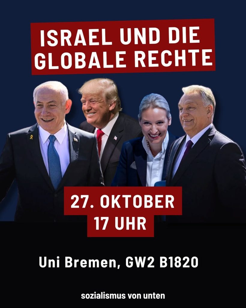 Kategorie: General Israel und die globale Rechte - Sozialismus von unten 17:00 27. Oktober 2025 BremenVeranstaltungsort anschauen Kompletten Kalender ansehen