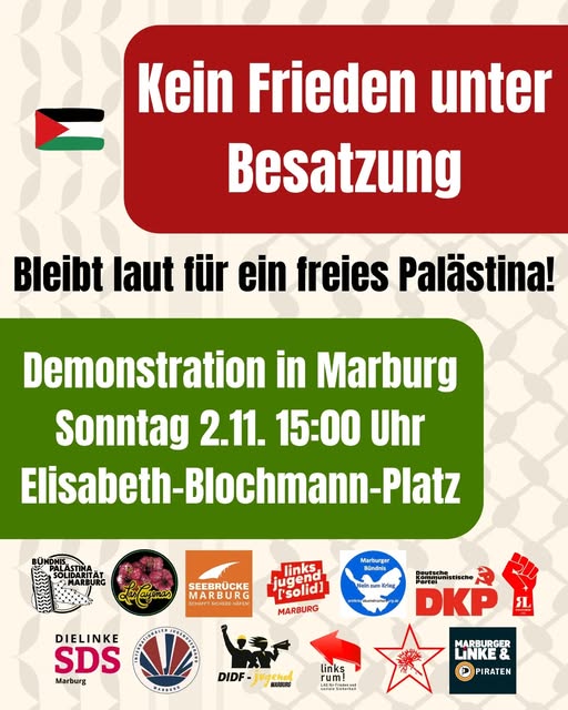 Kategorie: General Demonstration - Kein Frieden unter Besatzung - Bleibt laut für ein freies Palästina! 15:00 2. November 2025 MarburgVeranstaltungsort anschauen Kompletten Kalender ansehen