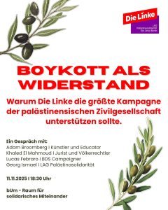 Nächsten Dienstag [11-11-2025] kommen wir im @bum.berlin zusammen, um mit @adambroomberg, @khaled.el.m, @lucas.febraro und @potatoejunge über die größte Kampagne der palästinensischen Zivilgesellschaft zu diskutieren: BDS.Anlass ist der von uns für den Landesparteitag der Linken Berlin gestellte Antrag A19, der die Entkriminalisierung von BDS und PACBI und die Unterstützung zivilgesellschaftlicher Kampagnen gegen Apartheid und Besatzung fordert.