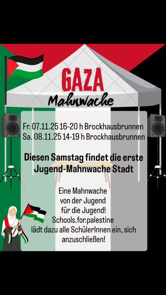 Kategorie: General Gaza Mahnwache - Eine Mahnwache von der Jugend für die Jugend! 16:00 – 20:007. November 2025 Frankfurt / MVeranstaltungsort anschauen Kompletten Kalender ansehen