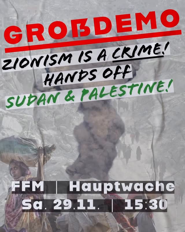 Kategorie: General Großdemo - Zionism is a crime! Hands off Sudan & Palestine! 15:30 29. November 2025 Frankfurt / MVeranstaltungsort anschauen Kompletten Kalender ansehen