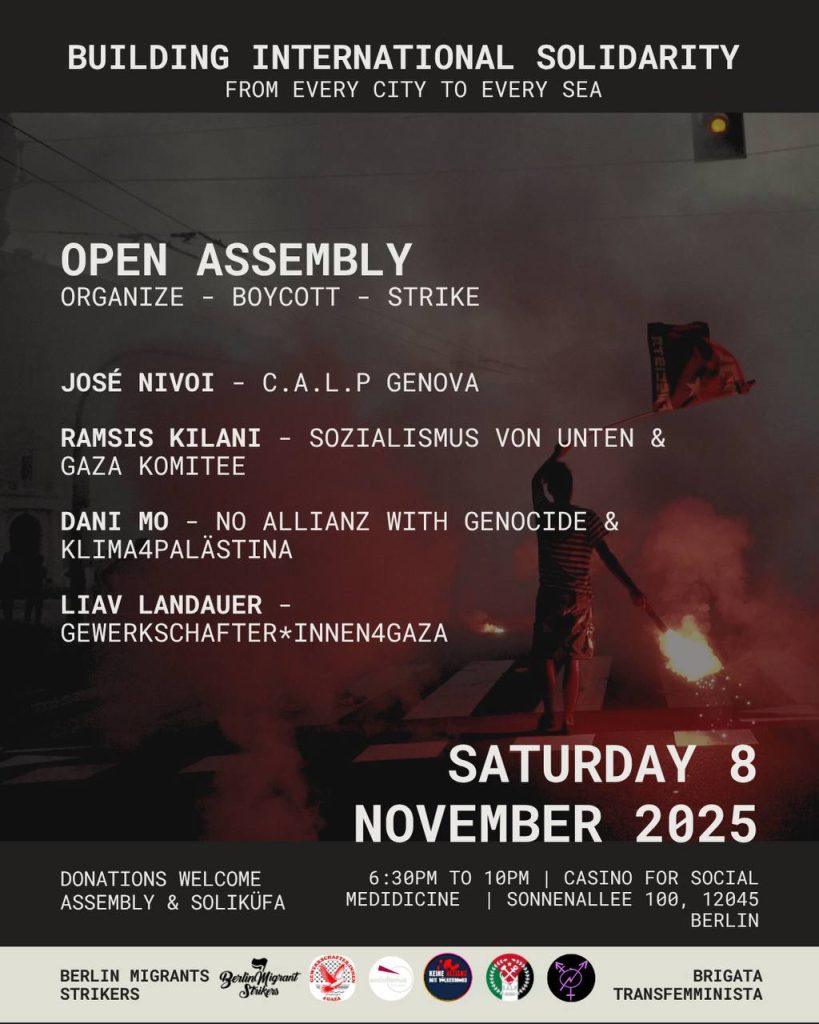 Kategorie: General Open Assembly: Organize - Boycott - Strike 18:30 8. November 2025 BerlinVeranstaltungsort anschauen Kompletten Kalender ansehen