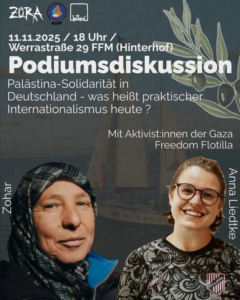 Kategorie: General Podiumsdiskussion - Palästina-Solidarität in Deutschland 18:00 11. November 2025 Frankfurt / MVeranstaltungsort anschauen Kompletten Kalender ansehen