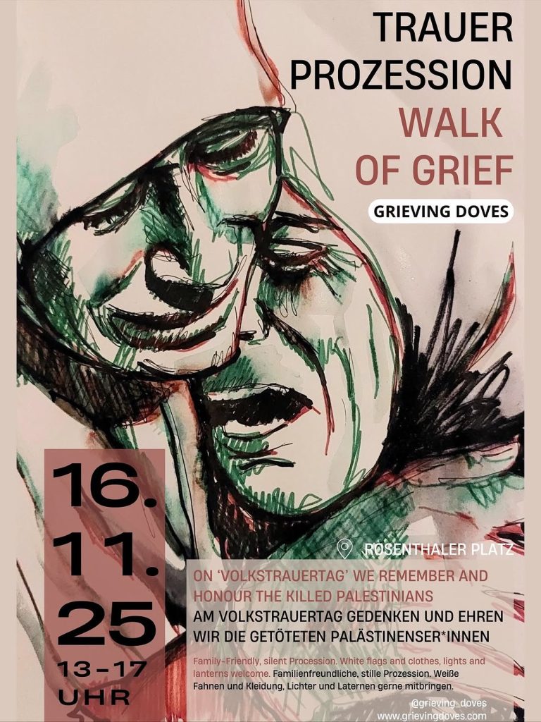 Kategorie: General Trauer Prozession - Walk of Grief - Am Volkstrauertag gedenken und ehren wir die getöteten Palästinenser*innen 13:00 – 17:0016. November 2025 BerlinVeranstaltungsort anschauen Kompletten Kalender ansehen