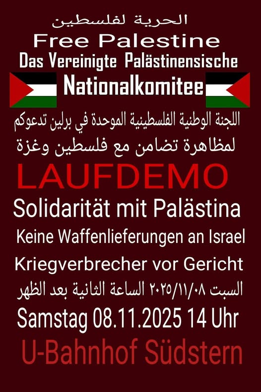 Veranstaltungskalender Kategorie: General Laufdemo - Solidarität mit Palästina - Keine Waffenlieferungen an Israel 14:00 8. November 2025 BerlinVeranstaltungsort anschauen Kompletten Kalender ansehen
