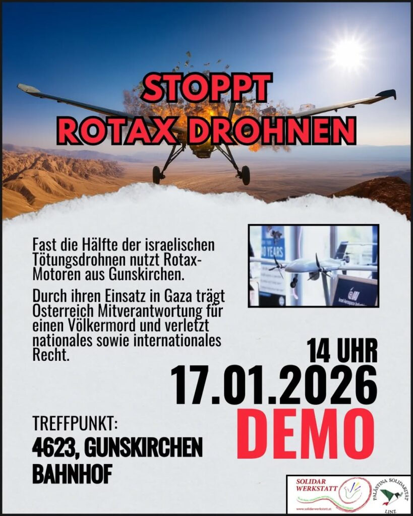 Kategorie: General Demo - Stoppt Rotax Drohnen - Bahnhof 14:00 17. Januar 2026 GunskirchenVeranstaltungsort anschauen Kompletten Kalender ansehen