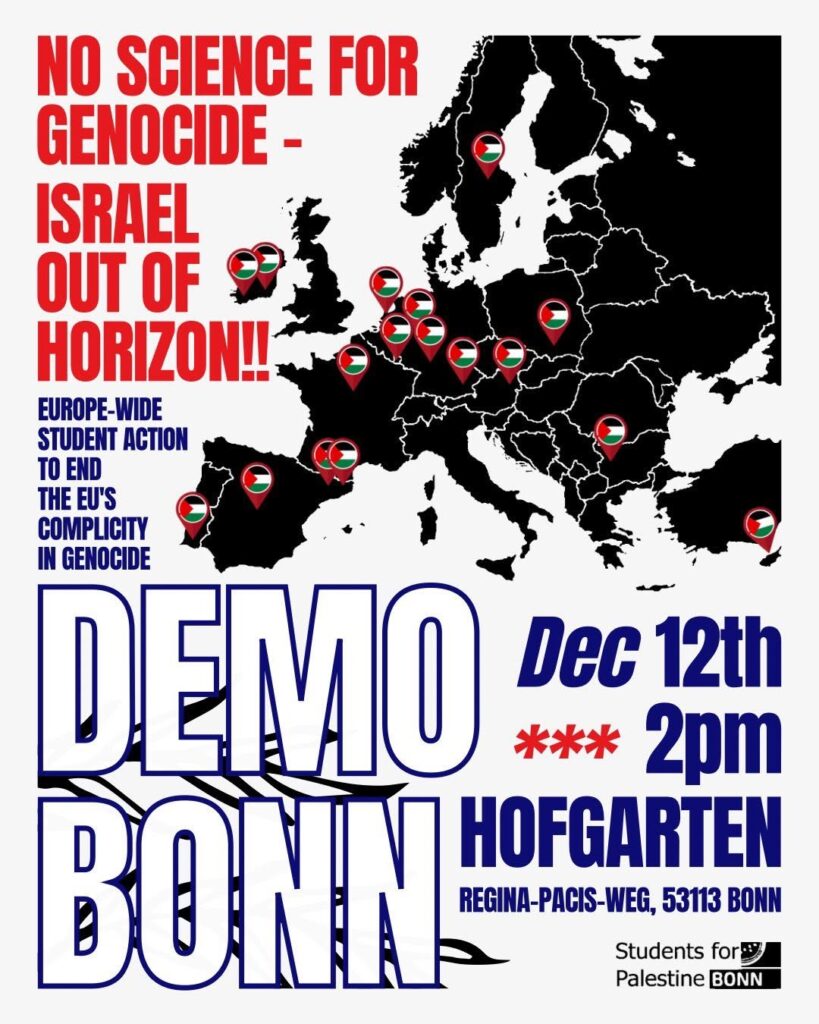 Veranstaltungskalender Kategorie: General Demo - No Science for Genocide - Israel out of Horizon!! 14:00 12. Dezember 2025 BonnVeranstaltungsort anschauen Kompletten Kalender ansehen