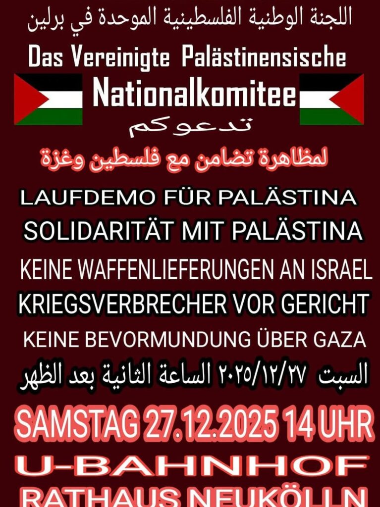Veranstaltungskalender Kategorie: General Laufdemo für Palästina - Solidarität mit Palästina - Keine Waffenlieferungen an Israel 14:00 27. Dezember 2025 BerlinVeranstaltungsort anschauen Kompletten Kalender ansehen