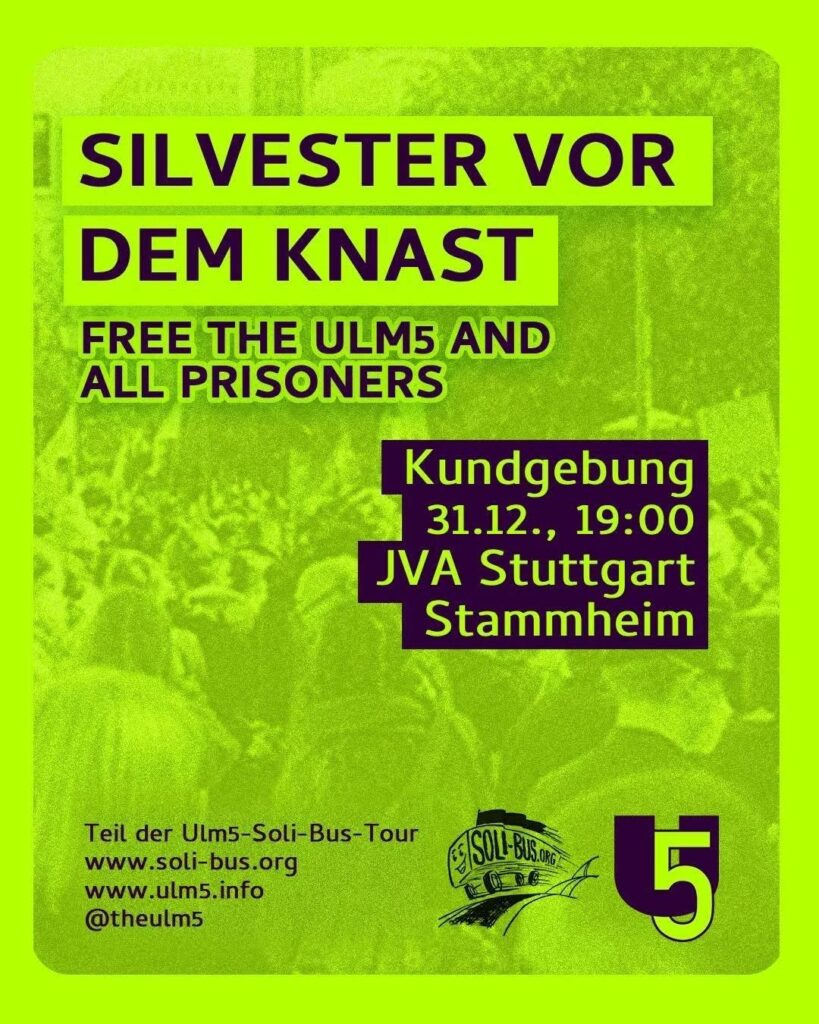 Kategorie: General Silvester vor dem Knast - Free the Ulm5 and all prisoners 19:00 31. Dezember 2025 StuttgartVeranstaltungsort anschauen Kompletten Kalender ansehen