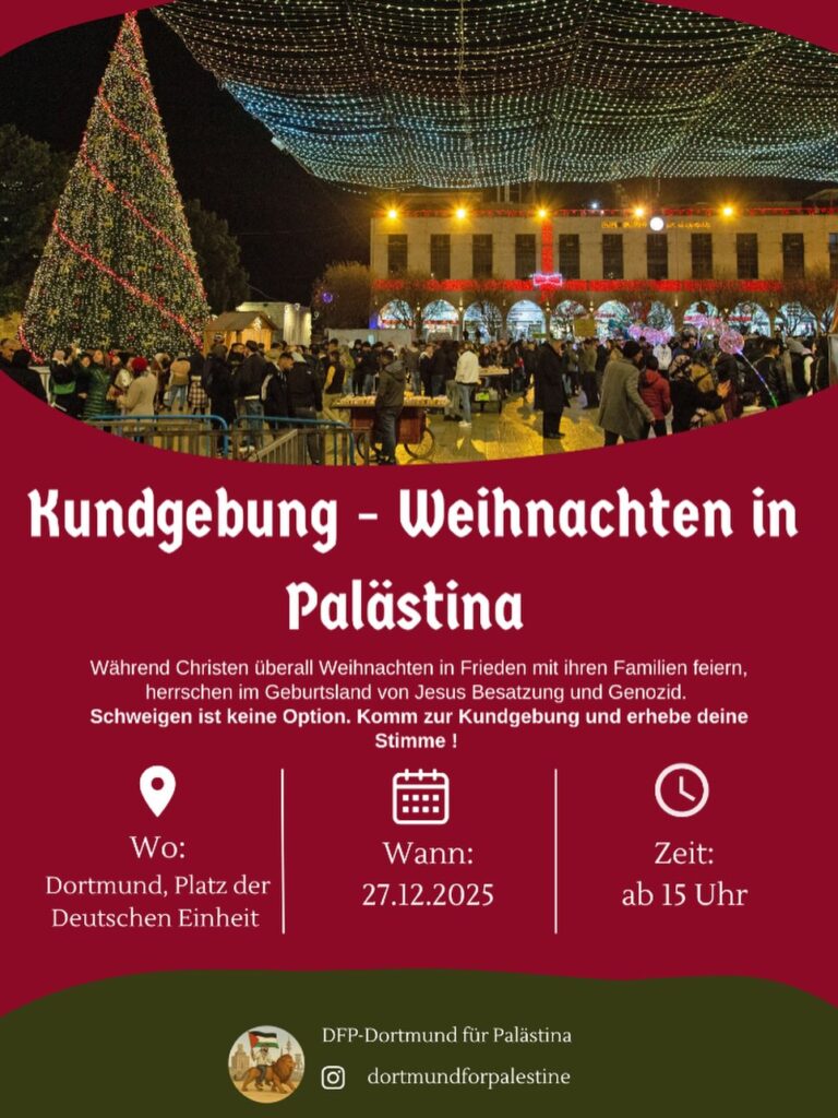 Veranstaltungskalender Kategorie: General Kundgebung - Weihnachten in Palästina - Schweigen ist keine Option 15:00 27. Dezember 2025 DortmundVeranstaltungsort anschauen Kompletten Kalender ansehen