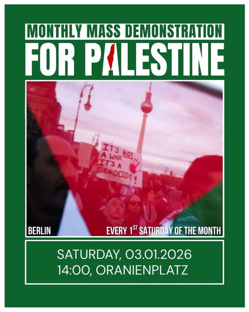 Veranstaltungskalender Kategorie: General Monthly Mass Demonstration for Palestine 14:00 3. Januar 2026 BerlinVeranstaltungsort anschauen Kompletten Kalender ansehen